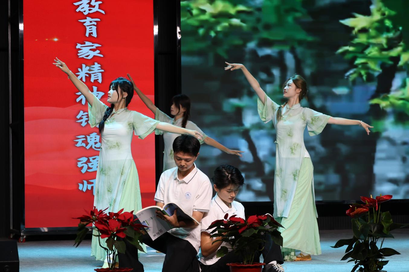 表彰儀式后,精彩的文藝匯演隨即拉開帷幕。首個登場的歌舞朗誦《老師我想你》,以悠揚(yáng)歌聲、優(yōu)美舞姿與真摯朗誦相融合,將學(xué)生對老師的深切敬意與感恩之情具象化。情景劇《師者芳華》通過細(xì)膩的情節(jié)與鮮活的演繹,再現(xiàn)教師日常工作的堅守與溫暖;歌曲朗誦《老師謝謝您》則以質(zhì)樸的語言與動人的旋律,直白傳遞出學(xué)生對老師的感激與回饋之心。一個個精彩節(jié)目緊扣感恩主題,用不同藝術(shù)形式詮釋著師生間的深厚情誼,贏得現(xiàn)場陣陣掌聲。報告廳始終洋溢著歡樂祥和的氛圍,將師生情誼與校園溫情推向高潮。