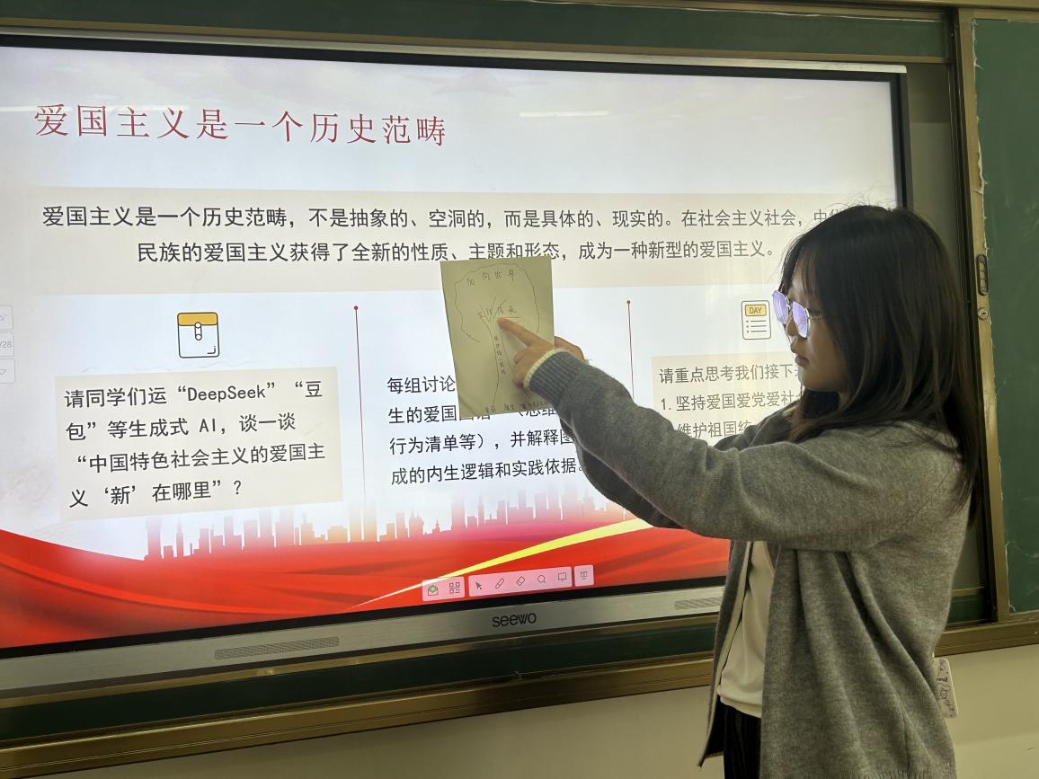 課堂現(xiàn)場:在明確了“為何愛國”“何為愛國”后,課程邁向最關(guān)鍵一步——“如何愛國”。老師引導(dǎo)學(xué)生運(yùn)用“DeepSeek”“豆包”等生成式AI工具,自主探究“中國特色社會(huì)主義愛國主義之‘新’”。各小組隨后合作繪制“新時(shí)代大學(xué)生的愛國圖譜”,將抽象的擔(dān)當(dāng)轉(zhuǎn)化為一份份具體的行為清單和思維導(dǎo)圖,實(shí)現(xiàn)了知行合一的教學(xué)目標(biāo)。